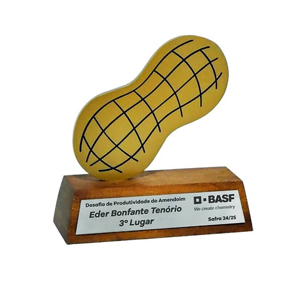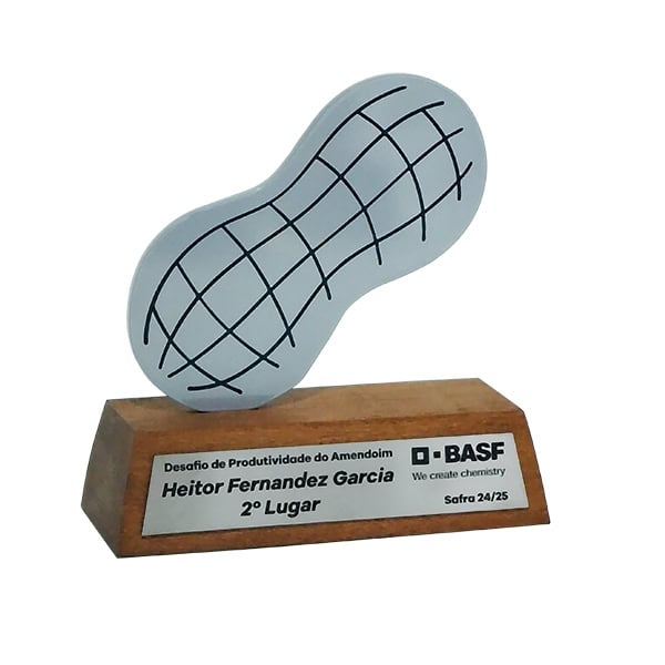 Troféu em alumínio escovado no formato de planta de amendoim, 16×0,6 cm espessura, cor prata e pintura tom ouro e bronze. Gravação laser. Base madeira nobre 20x8x5 cm altura. Placa aço inox com impressão digital personalizada. Peça com 20 cm de altura final.