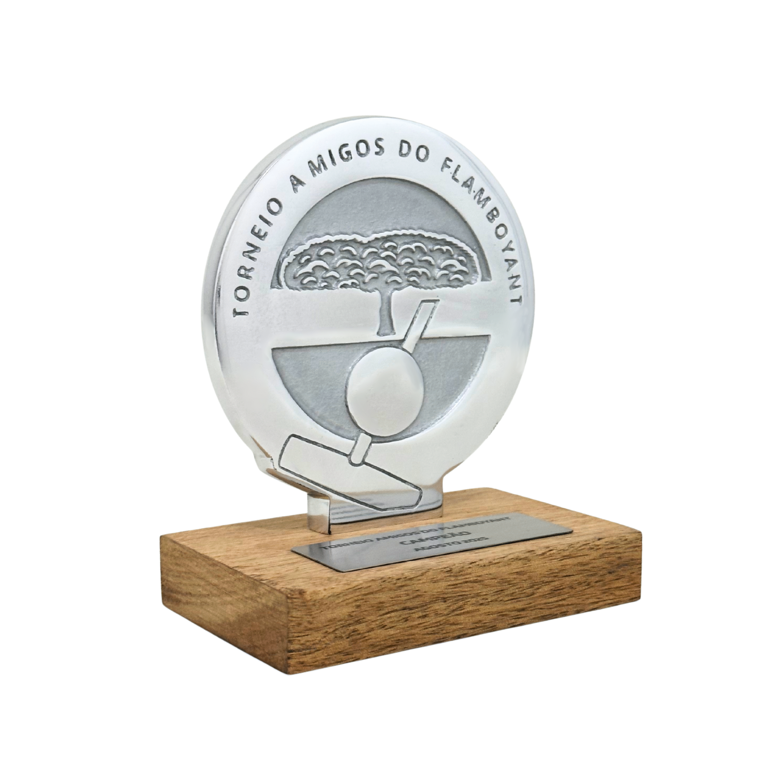 Troféu fundição artística de latão polido, cor ouro, e alumínio, cor prata, 12 cm de altura. Base madeira nobre, 12x8x2 cm. Placa aço inox com impressão digital personalizada.