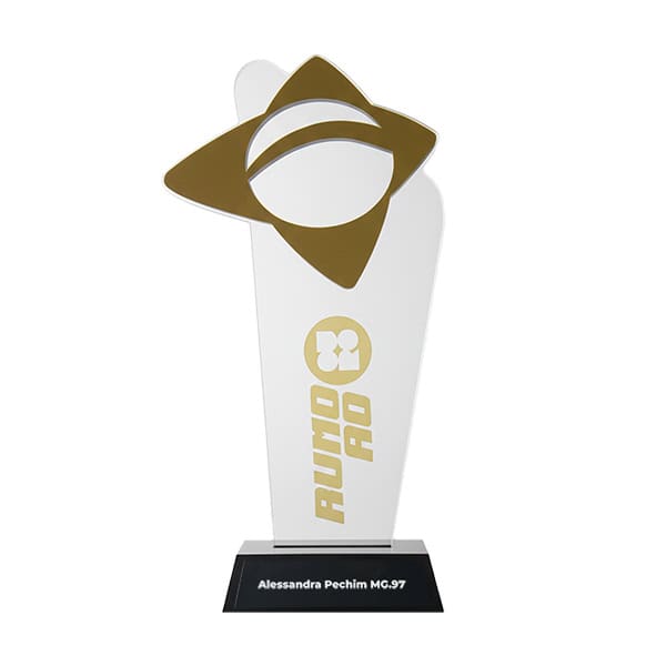 Troféu Geral Gestores, acrílico cristal 45 cm de altura x 2 cm de espessura. Impressão digital personalizada. Sobreposição elemento em acrílico espelhado frente e verso cor ouro, prata e cor bronze. Base caixa acrílico preto 18x10x5 cm de altura. Placa de base acrílico preto com impressão digital.