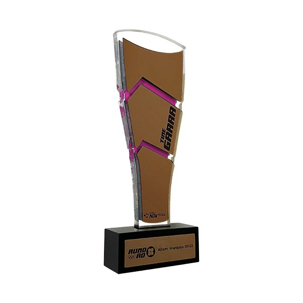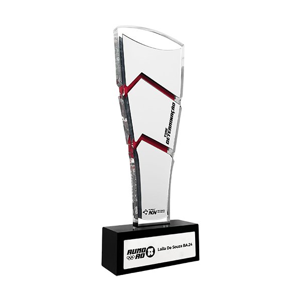 Troféu Times Gestores, acrílico cristal 37 cm de altura x 1,5 cm de espessura, com impressão digital. Sobreposição acrílico espelhada cor ouro, prata e bronze. Gravação laser. Base caixa acrílico preto 15x7x5 cm de altura. Placa de base acrílico espelhado com gravação laser.
