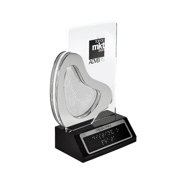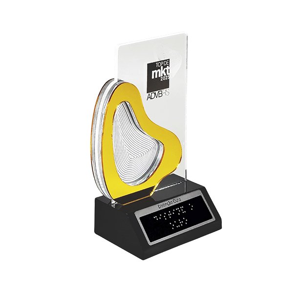 Troféu composto por três acrílicos cristais: 1 com 18 cm de altura x 11 cm largura x 0,5 cm de espessura e 2 com 14 cm altura x 0,5 cm espessura. Impressão digital personalizada. Sobreposição de acrílico cor azul, ouro e prata, frente e verso, 0,2 cm de espessura. Gravação laser. LED branco. Base caixa acrílico, cor preto 12x7x4 cm de altura com chanfro frontal. Placa aço inox fixada na parte frontal da base 8×3 cm com impressão digital. Placa aço inox 4×1,5 cm fixada na parte inferior na base com impressão digital. Peça 22 cm altura final.
